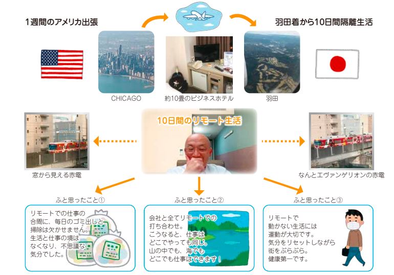 その112 「自主 KAKURI 日記」 編 アメリカへの海外出張から帰国すると、10日間の自主隔離期間に入りました。隔離は入国後10日目に再びPCR検査を受け、陰性ならば隔離終了となりますそこで今月はビジネスホテルで過ごした10日間の自主隔離体験記です。 私の晩御飯(食事は全てテイクアウトです) いろいろなテイクアウトを楽しみつつも、「家庭の味」をちょっぴり恋しく感じました。 そして10畳のビジネスホテルで10日間過ごし、いろいろなことを感じ、久しぶりに家に帰ると・・・やっぱり「ホッ」としました。 << 前の記事 一覧へ戻る 次の記事 >>